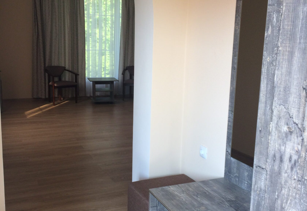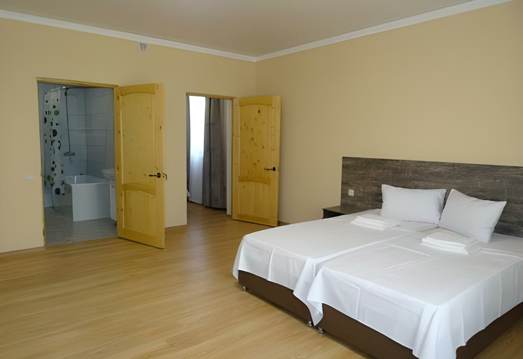 Площадь номера - 54 кв.м. 2 комнаты. 4 осн. места. в спальне две 1-спальные или одна 2-спальная кровати, в детской одна 2-ярусная кровать. Отдельный вход в номер (вид на горы и сад). В номере: телевизор; холодильник; кондиционер; ванна; туалет; диван; журнальный столик; кресло. 1 доп. место: